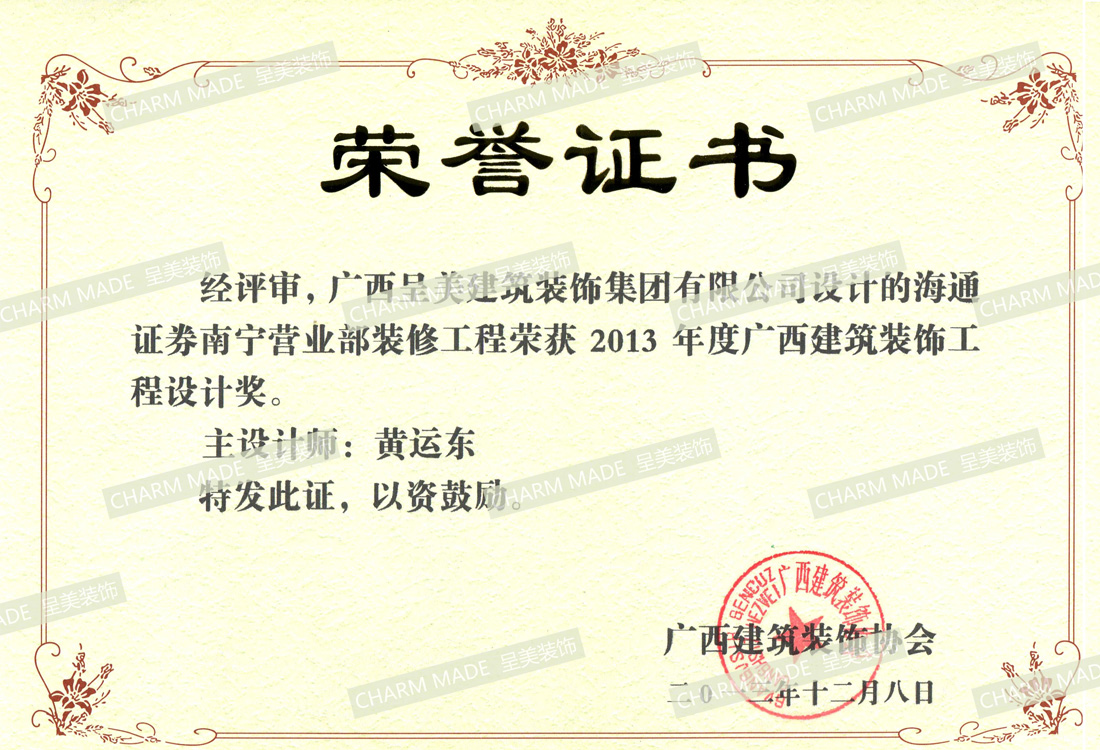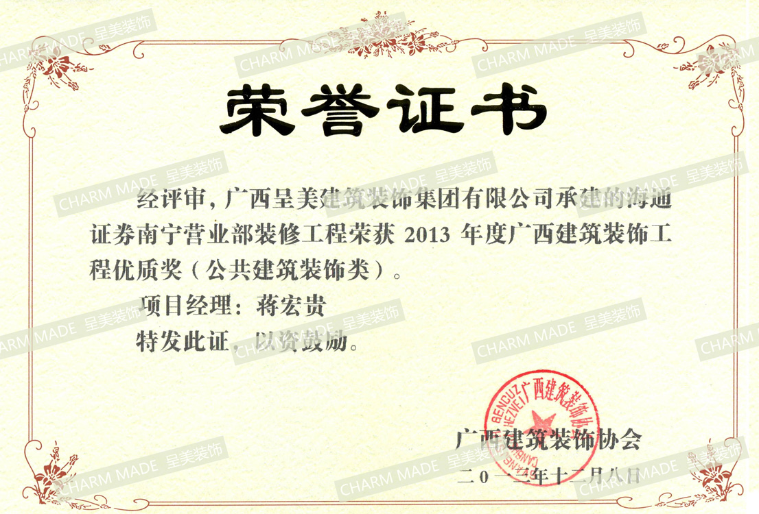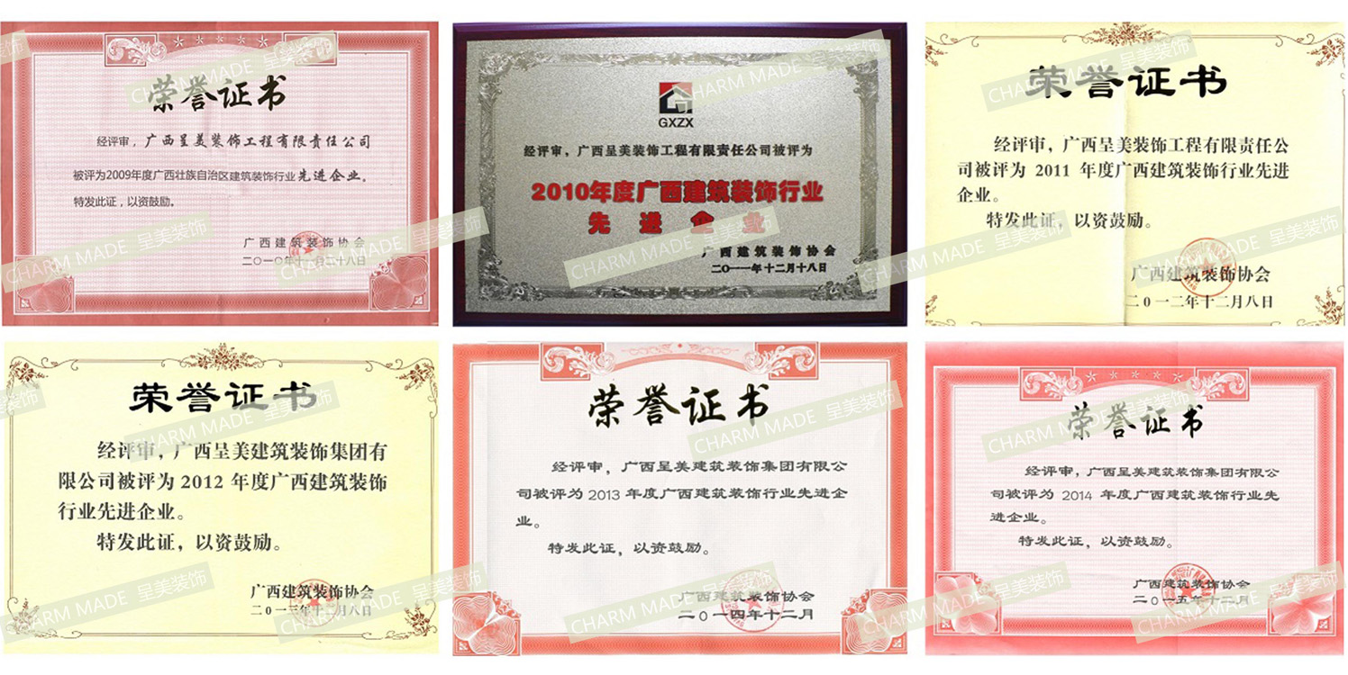 2009年~2014年 我司連續(xù)6年榮獲 廣西建筑裝飾行業(yè)先進企業(yè)