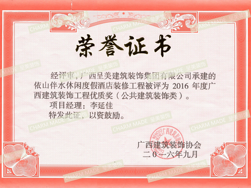2016年度廣西建筑裝飾工程優(yōu)質獎(依山伴水酒店項目)