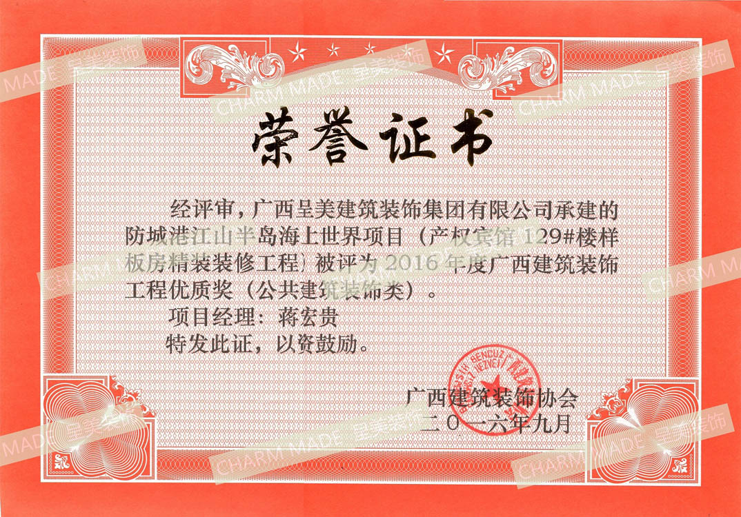 2016年度廣西建筑裝飾工程優(yōu)質獎(海上世界項目)